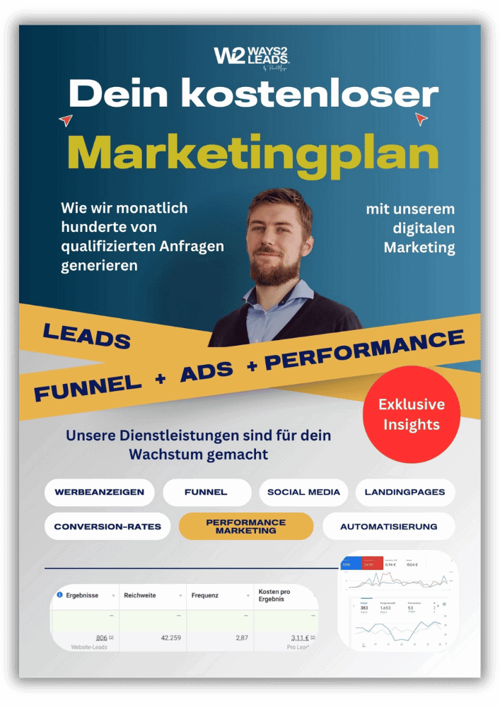 Ich bin Performance Marketer, Stratege und kreativer Denker in einer Person. Mit meiner Agentur Ways 2 Leads habe ich dutzende Projekte im Premium-Segment aufgebaut und betreut – von Coaches über Berater bis hin zu spezialisierten Dienstleistern. Immer mit dem Fokus auf: Was bringt wirklich Umsatz, Effizienz und Wachstum?